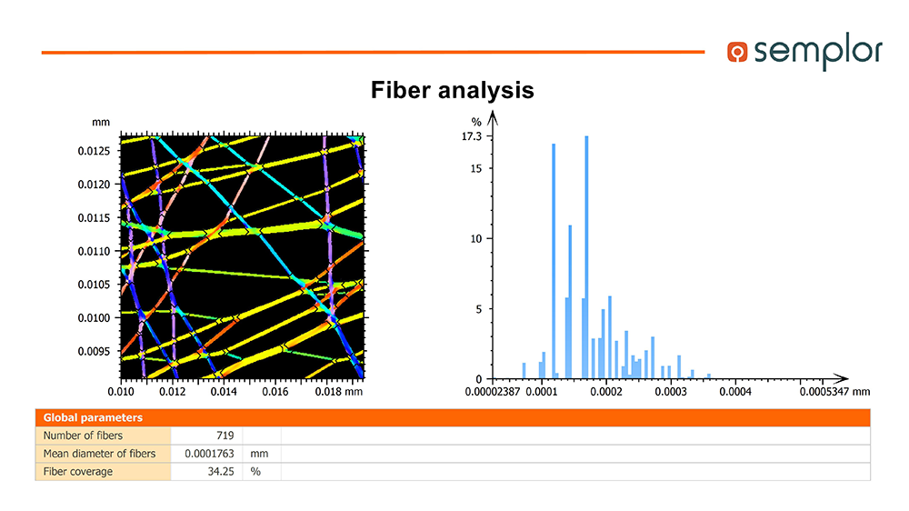 Explore Fibers: specifically designed for fiber analysis, this module measures diameter, orientation and coverage and can accurately trace overlapping or touching fibers. Orientation distributions and pore characteristics are automatically generated, providing valuable statistics for textiles, nonwovens, electrospun materials and more.