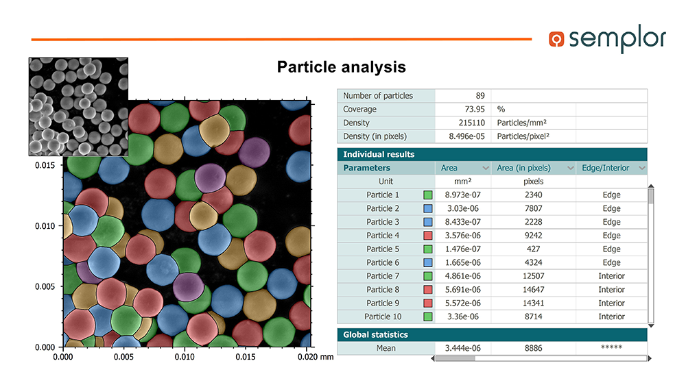 Explore Particles: detect, quantify and measure particles, pores, or grains with precision. The module offers multiple segmentation methods, including thresholding and watershed, to overcome challenges in particle dispersion or sample preparation. Even touching particles can be separated and analyzed individually. Results include size, area, perimeter, shape descriptors and count distributions, with visual overlays that clearly display particle boundaries.